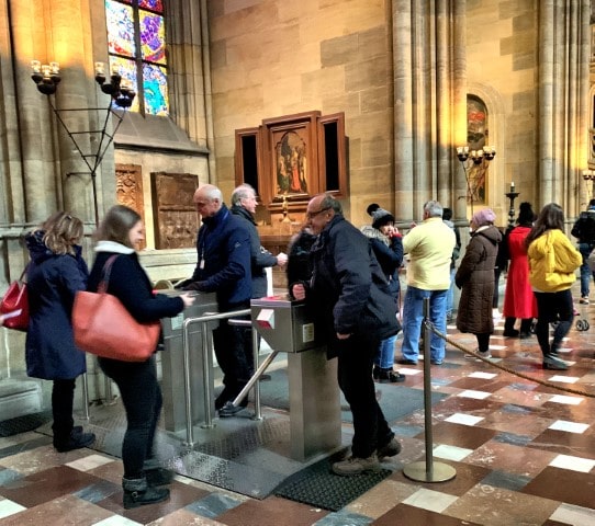 it’s door were unlocked, only for mass times, to prevent the Chinese tourists, doing as they did in the Cathedrial in the City Square, unknowingly the males walking around with hats on, taking photos despite the no photos sign.